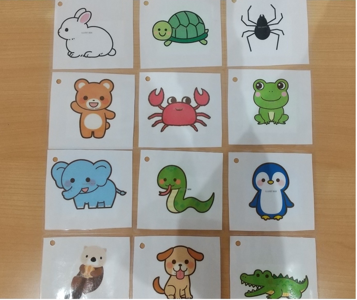①動物のイラストが描いてある絵を「この動物はなーんだ?」と、クイズ形式で子ども達に見せます。