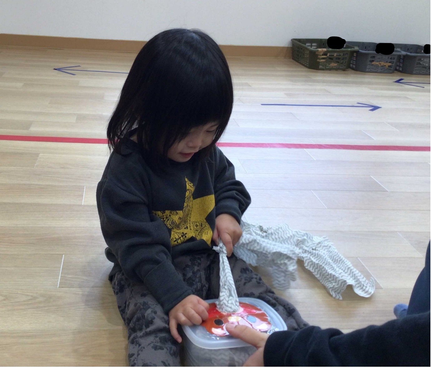 そこで、取りやすくするために布の大きさを半分に切ると、少し引っ張るだけで取り出せるようになり、今では、中に入っている布がなくなるまで集中して遊んでもらえるようになりました!!