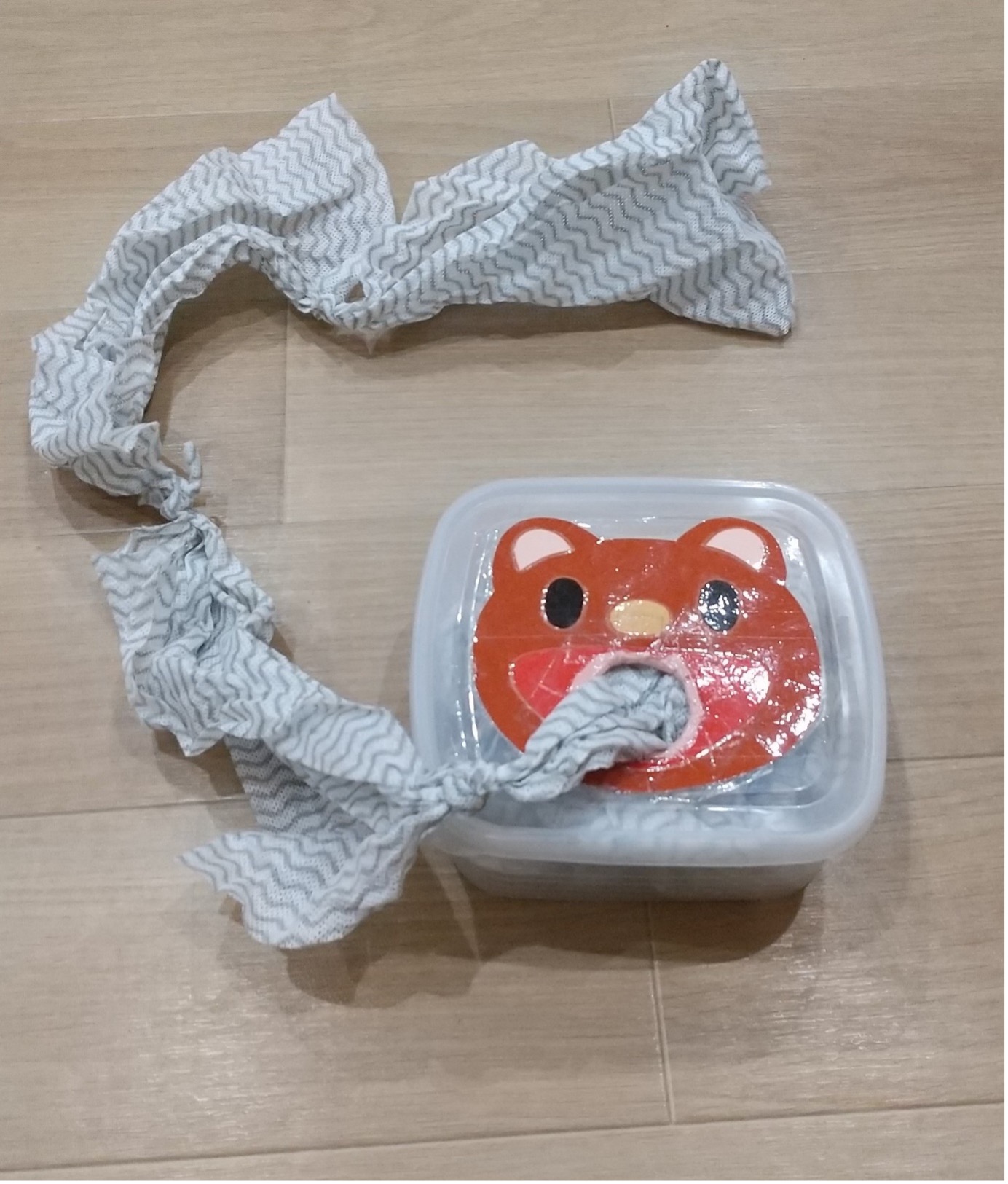 (100均などでティッシュケースを買っても良いのですが、今回はもともと教室にあったポットン落としの入れ物を併用して使っています。)