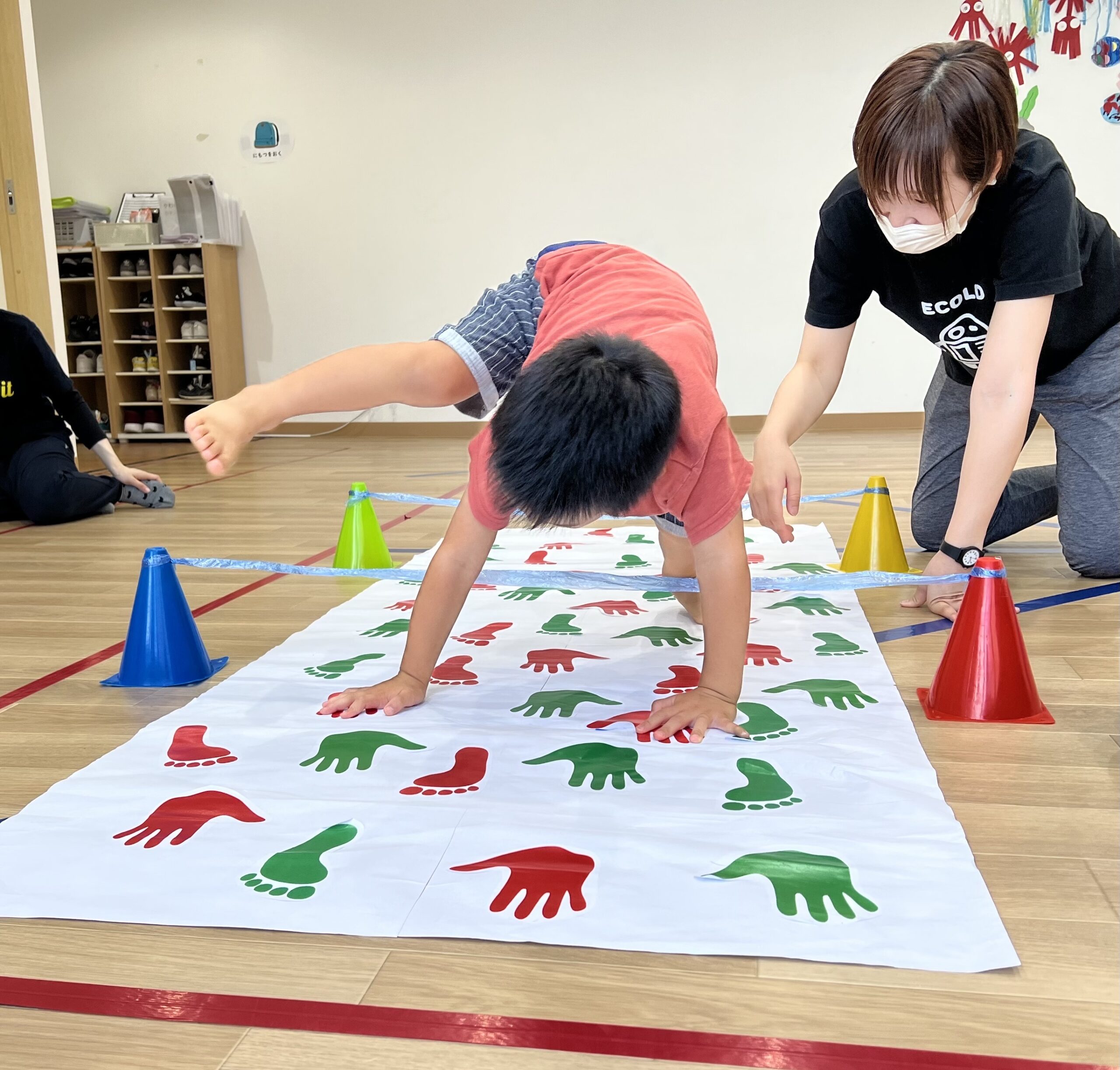 左右の手足をバラバラに動かすクマ歩きは、けっこう大変です。その上「赤の手形・足型の上だけを歩く」という条件つき。