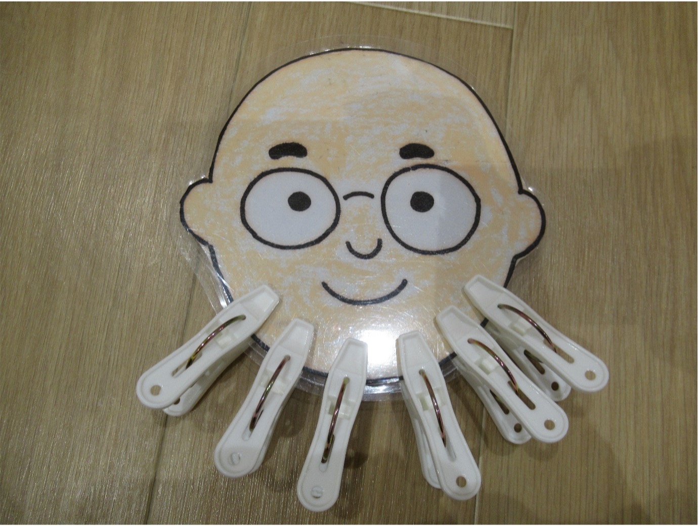 洗濯ばさみを髭に見立てて顎の部分につけていますね!