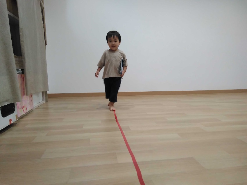 用意するものは、カラーテープのみ!好きな色でいいですが、床の色と見分けがつきやすい色にすると良いでしょう!ルールは簡単!床にまっすぐカラーテープを貼ってその上を歩きます。テープを見て足を動かすので目と足の協調運動ができますね!応用としては、後ろ歩きをしてみたり、テープをジグザグに貼ってみたりすると楽しいですね!
