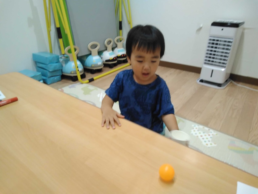 用意するものは、机、紙コップ(似ているもので代用可)、コップに入る大きさの転がるもの(ピンポン玉、ミニカー、電池、スーパーボールなど)。ルールは簡単!大人が机の上にピンピン玉などを転がして子どもは落ちる前にコップでキャッチします。動くものを目で追ってそれに合わせて手で持っているコップを動かすことで目と手の協調運動ができますね!応用としては、転がす距離を長くしたり、転がすものを変えてみたりすると楽しく続けることができますね!