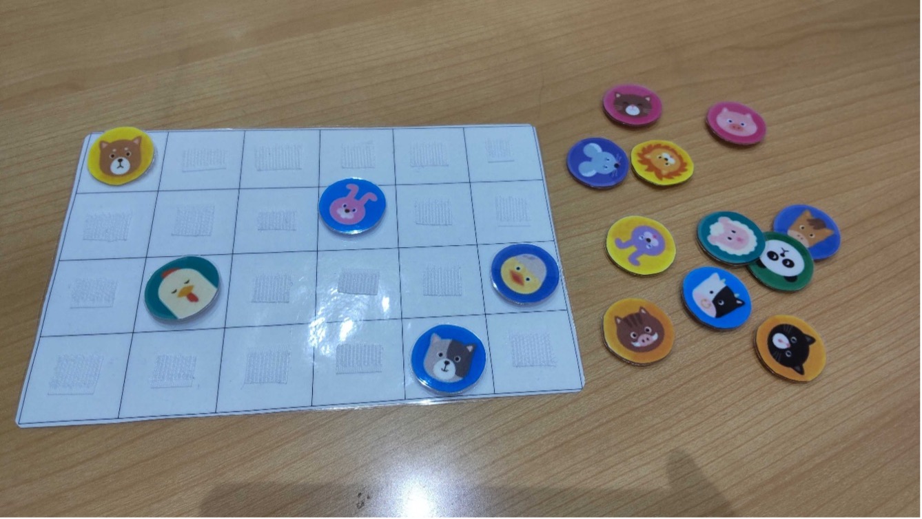格子状にマス目がある台紙に動物や数字、お寿司など子どもたちが好きな場所に貼ったり大人が貼ったところと同じところに貼ったりなど様々な方法で使っています。子どもたちに台紙とお寿司や動物たちを渡して好きなようにそれぞれのマス目に貼っていくようにしても良いですし、もちろん子どもと大人で1枚ずつマス目の台紙をもって大人が貼り付けたところと同じマス目の場所に子どもは貼っていくというようにしても楽しいですよ。