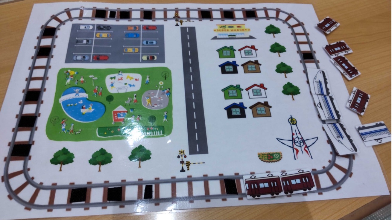 これは、名前の通りですね~。スーパーや家、道路、万博のシンボルを囲んだ線路に阪急電車やドクターイエロー、新幹線たちが出発していきます。線路の上に並んでついているマジックテープにどんどん子どもたちは好きな電車や新幹線を貼っていきます。簡単そうに見えてマジックテープに合わせて電車たちを貼ることが意外にも難しいんですよ!!線路と電車をマジックテープのオスとメスにしっかり合わせて貼らないとすぐに剥がれてしまったり上手く連結しなかったりするんですよー!電車たちのマジックテープは絵で隠れてしまっているため貼るときにマジックテープは見えない状態で線路に子どもたちは沢山貼っているんですよ~。すごいですよね!!