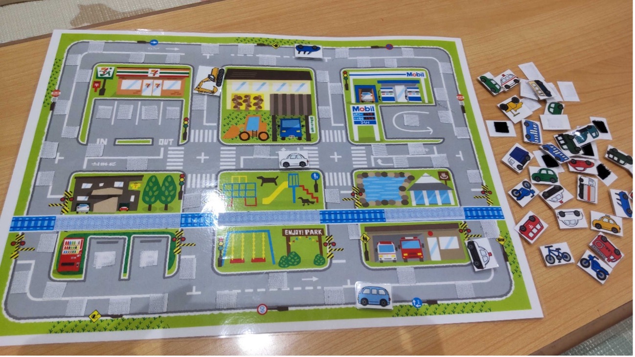 こちらもその名の通り‼カーレース会場の台紙に数ある車の中からレースに出場する車を選んでカーレースが行われていくものです。また、カーレースに観戦しにきた人たちのための駐車場も完備しているんですよ~。子どもによって駐車場に止める車から選んだりレースに出場する車から選んだりと車を貼り付けていく順番や種類はバラバラでどの車を貼るのかやレース場では車の向きをしっかりそろえて貼ったり他の車と反対向きに貼ってみたりする子どもたちもいるのでどんなふうに貼っていくのか車の向きを見ているかなど様々な点が見れるんですよ~。いつも見ていてワクワクしています!!!