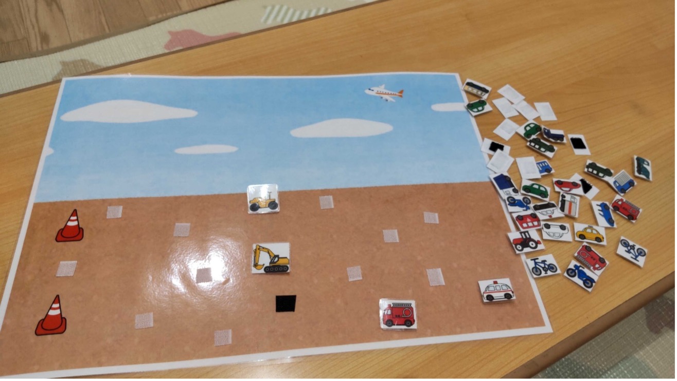 内容はものす――――――ごく簡単です!!子どもたちが好きな車や電車、工事車両などの絵にマジックテープをつけて道路や線路、工事現場、さらにカーレースなど様々な台紙にペタペタ貼っていきます。どんどん貼っていくと子どもたちだけの街並みやカーレース会場などが完成しちゃうんです!