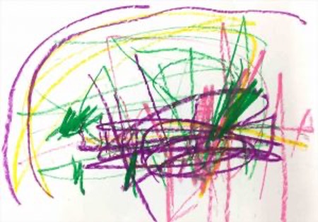 この時期の子どもの絵は運動的な快感とよごす興味によって描かれています。この時期の「なすりつけ」「こすりつけ」は決して意味のないものではありません。一つ一つの行為を感じ、確かめ実験を繰り返しているのです。