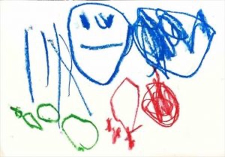 子どもはぐしゃぐしゃ描きをしているうちに、お話をするようになり、線のかたまりや円形らしき物を指して、「りんご」とか「おかあさん」とかいうようになります。