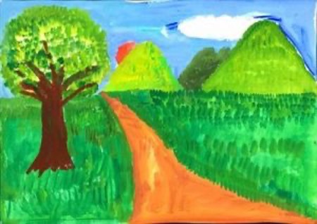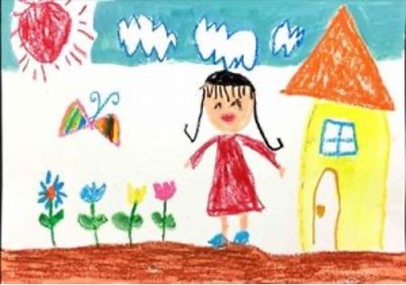 特徴的なことは、例えば家、木、太陽、山、花などに見られる記号的(図式的な)要素がどの子どもにも共通していることです。