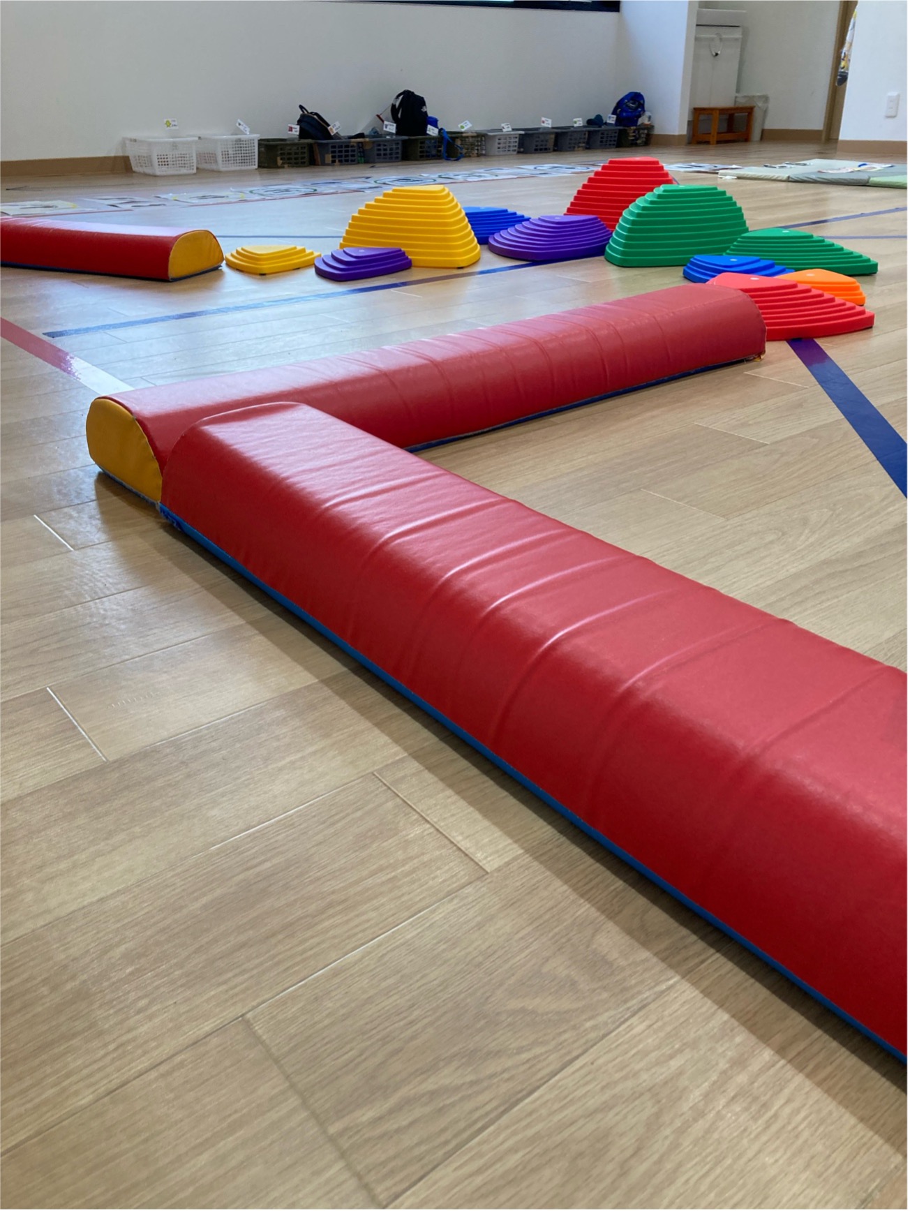1つ目は、幅が比較的に広い平均台です。この平均台は少し高さがあるので、足を上げて高いところに登る練習にもなります!また、幅が広いことで慣れてくると簡単に取り組めるので、下記の写真のように爆弾を貼ったり、ミニコーンを置き跨ぐという要素も取り入れています。