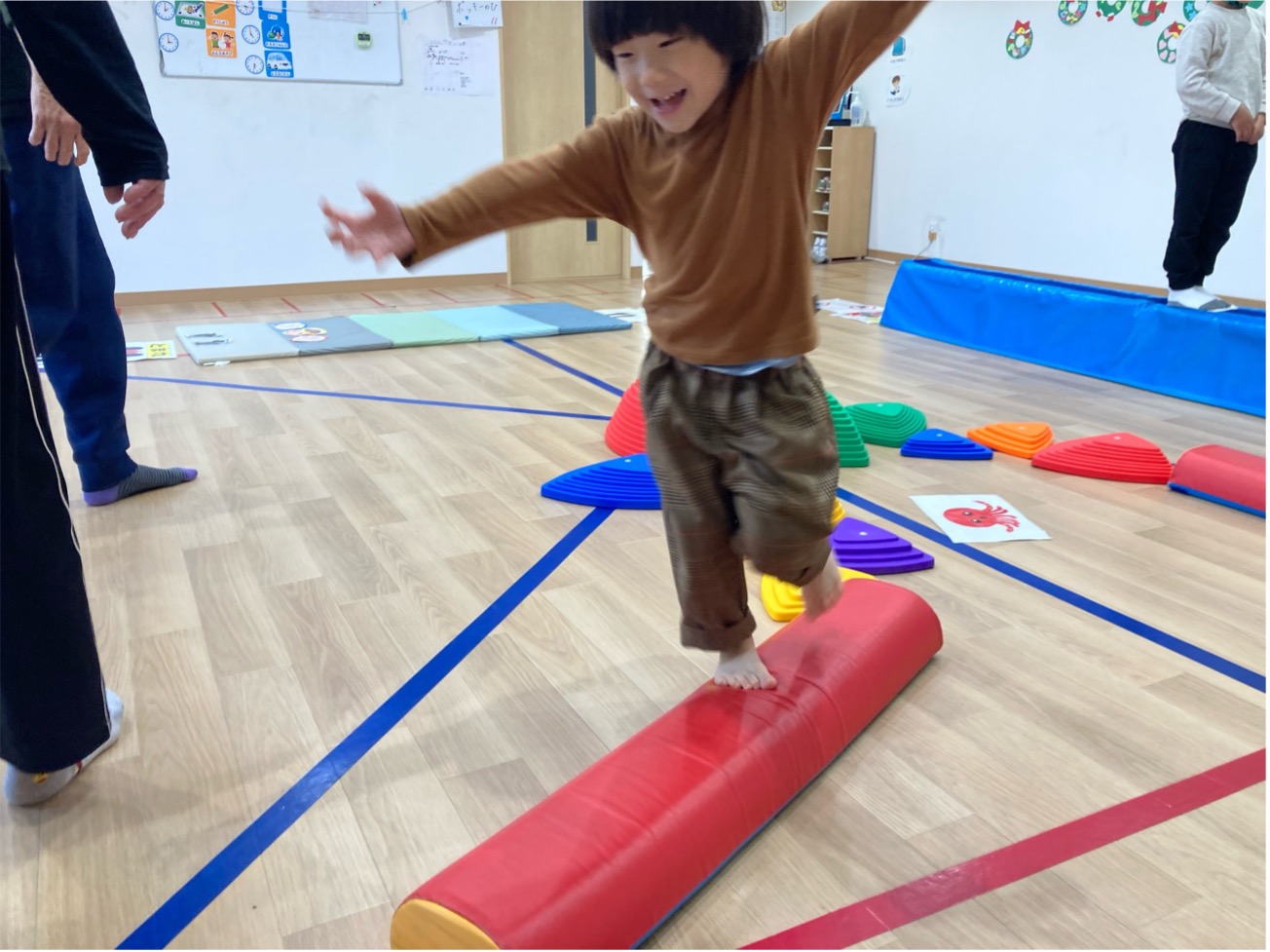 幼い時は少しの高さで恐怖を感じることが多いです。特に平均台は高くて細いのでより恐怖を感じる子ども達が多いのではないでしょうか?